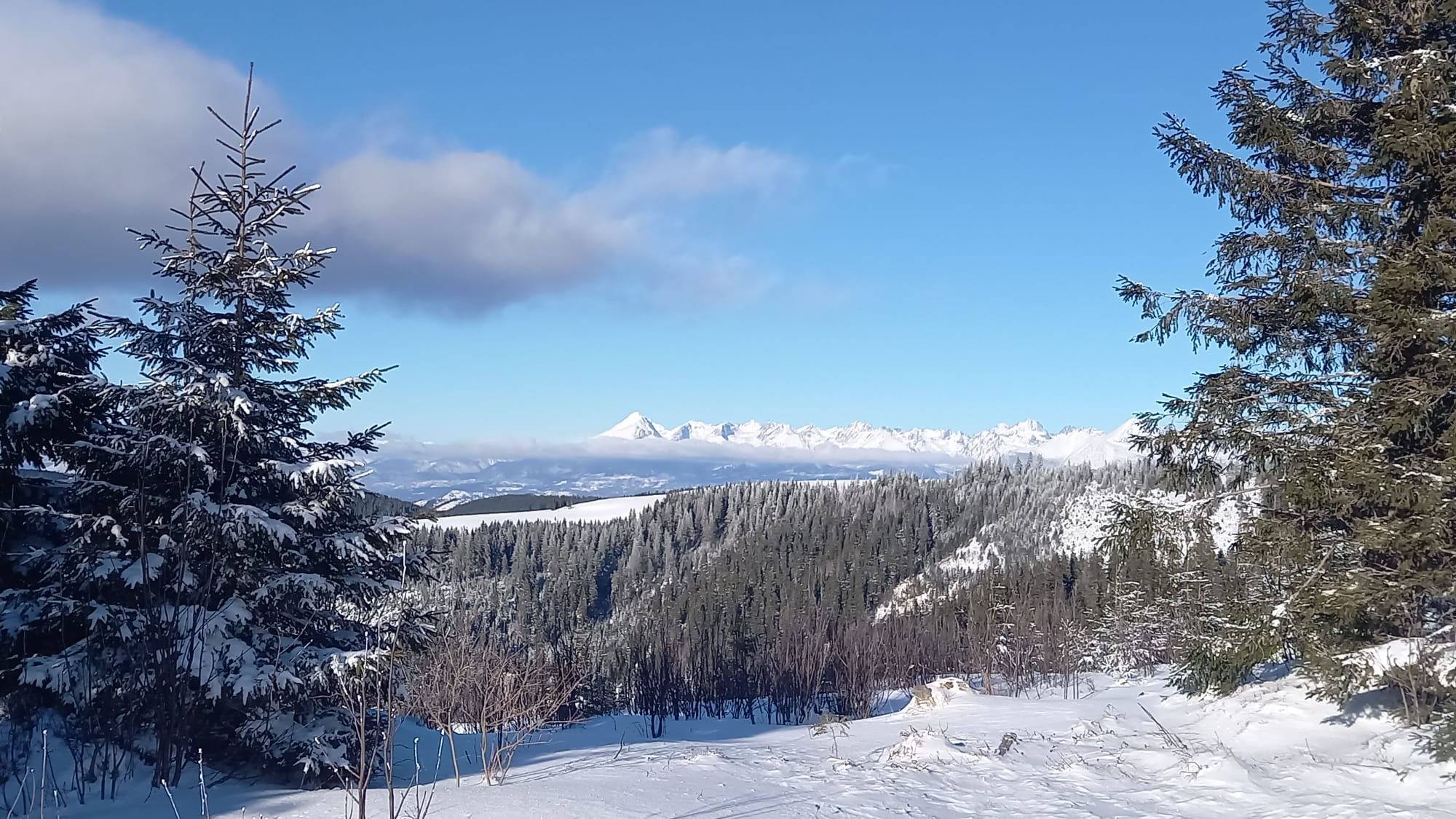 Pri východe z lesa na lúky je snehu dosť, nadmorská výška je tu ako na Štrbskom plese. Z Panskej hole sa dá šliapať ďalej po žltej značke, hrebeňom až ku chatke Budnárka. Otáčame ale kúsok skôr a po lúkach ideme až na Smrečiny ku hornému koncu vleku.