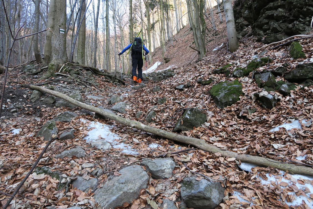 Stretávka na spodnom parkovisku v dohodnutom čase.Prvá prekážka je celkom výdatný potok,lebo lávky niet,a už si to smerujeme niekde do miest sedlo Kraviarske.Ideme napešo najprv po suchej cestičke,neskôr po kameňoch,medzi ktorými je ľad a na ňom lístie.Nie je to celkom pohoda,vyšie v bukovom traverze už fajne a sucho.