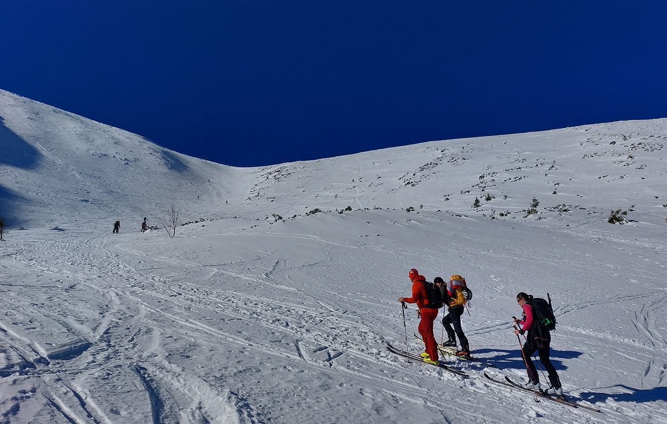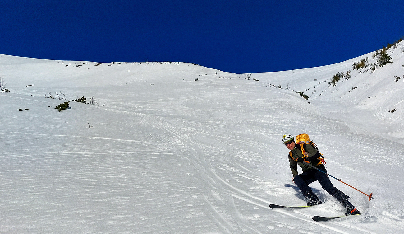 Ešte sme vyťapkali na Poľanu a nažhavení na jarné firny sme to odtiaľ stočili priamo dole po pláňach, niekam až tesne nad Vajskovský vodopád. Firny exkluzívne – na pevnom podklade natopená taká akurátna vrstvička, vôbec sa to ani v nižších polohách neborilo. Pre veľký úspech sme si to dali aj druhý raz, to už ale slnko dávalo poriadne cítiť svoju silu.