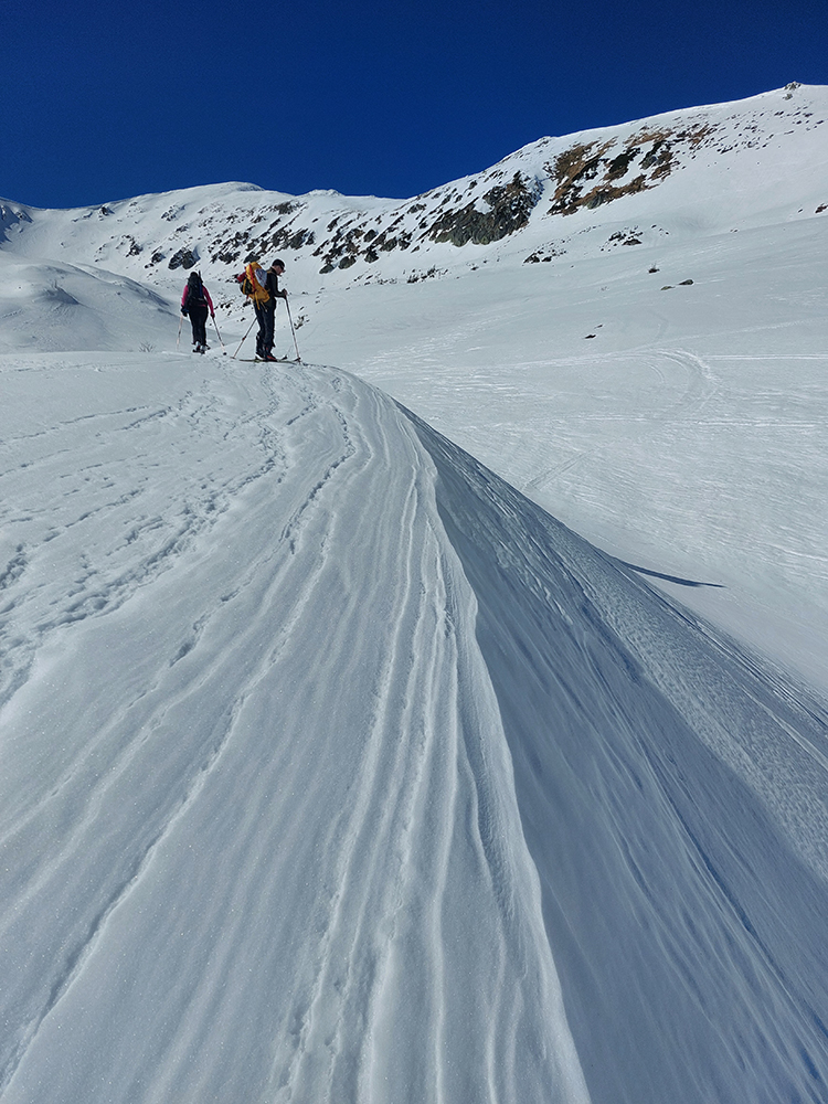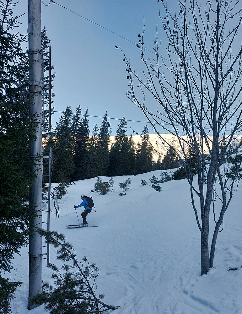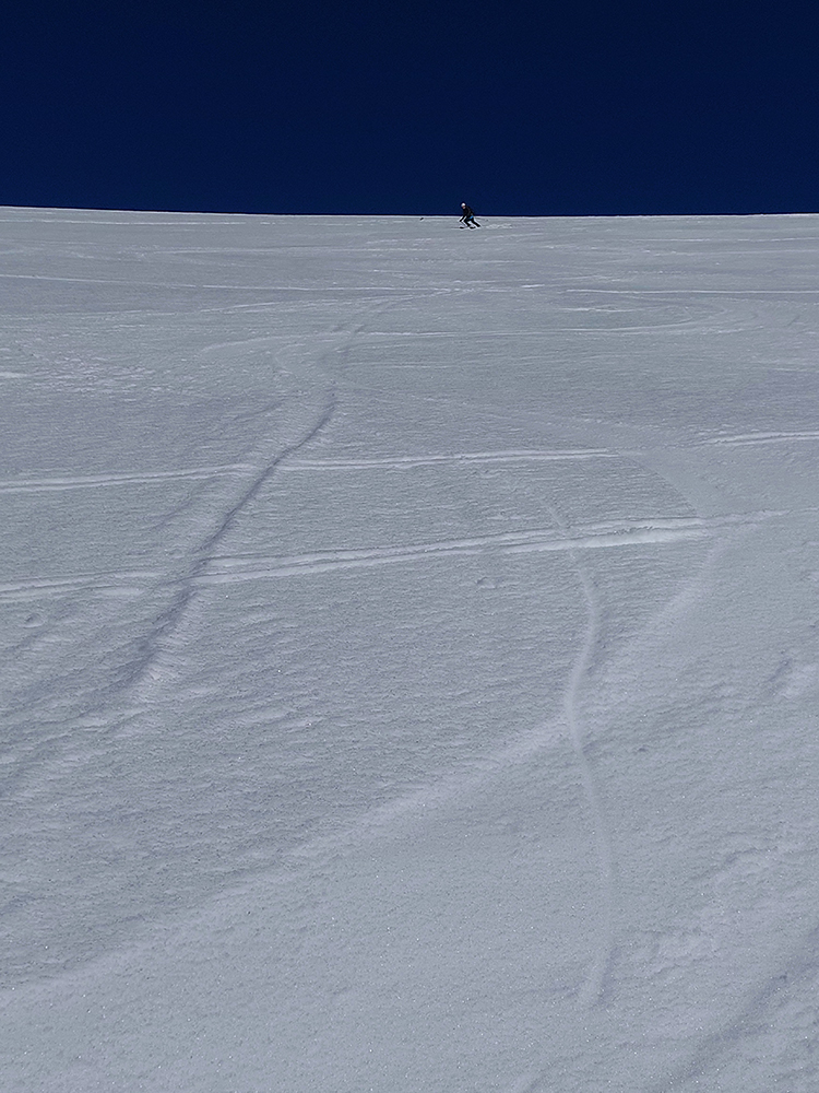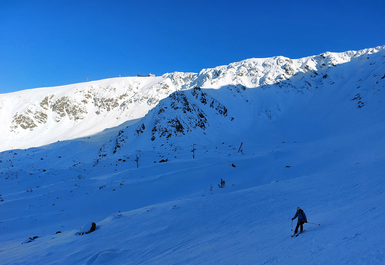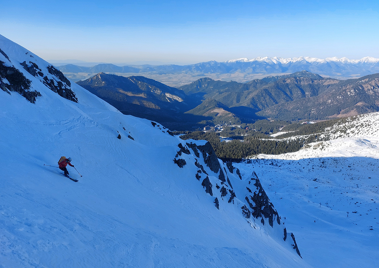 Ozaj dobré podmienky – tvrdý, državý sneh, bez ľadových platní, aj keď už tade hafo ľudí prešlo. V strede viac vyšmýkaný podklad, po okrajoch viac čerstvého a dole nazosúvaná múka z vyšších polôh. V nej sa najlepšie točili oblúky.