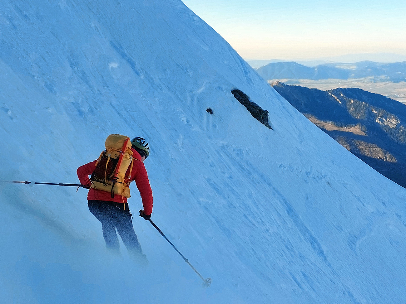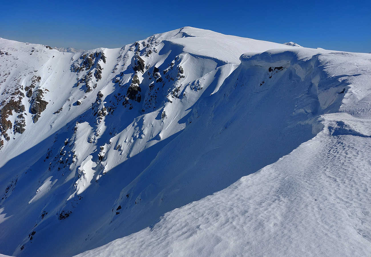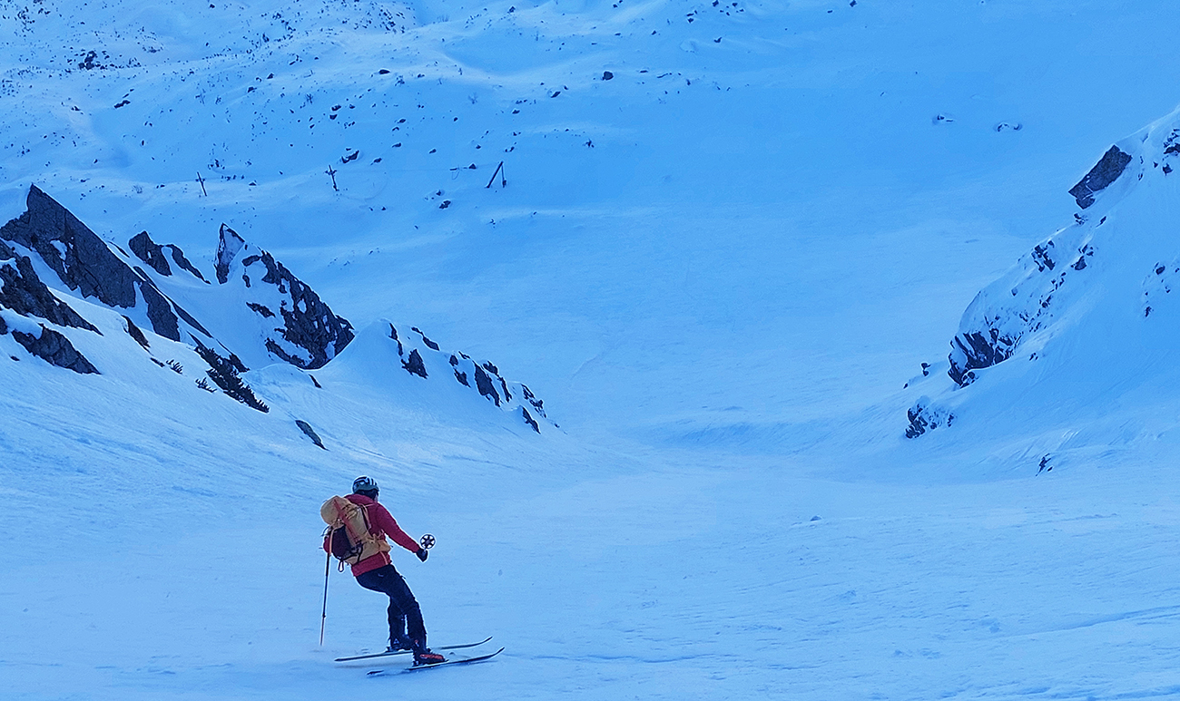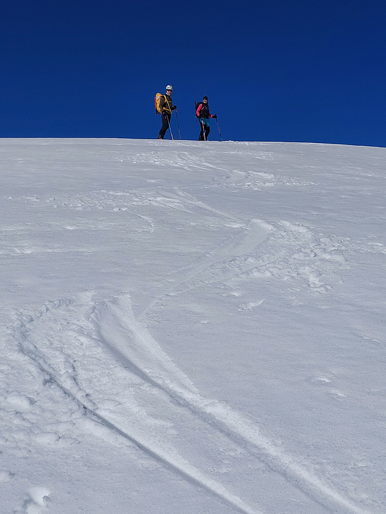 Ozaj dobré podmienky – tvrdý, državý sneh, bez ľadových platní, aj keď už tade hafo ľudí prešlo. V strede viac vyšmýkaný podklad, po okrajoch viac čerstvého a dole nazosúvaná múka z vyšších polôh. V nej sa najlepšie točili oblúky.